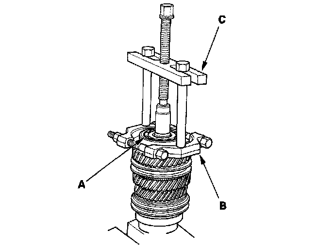 1. Remove the angular ball bearing (A) and the tapered cone ring using a commercially available bearing separator (B) and bearing puller (C). Make sure the bearing separator is under the tapered cone ring (5-speed model).