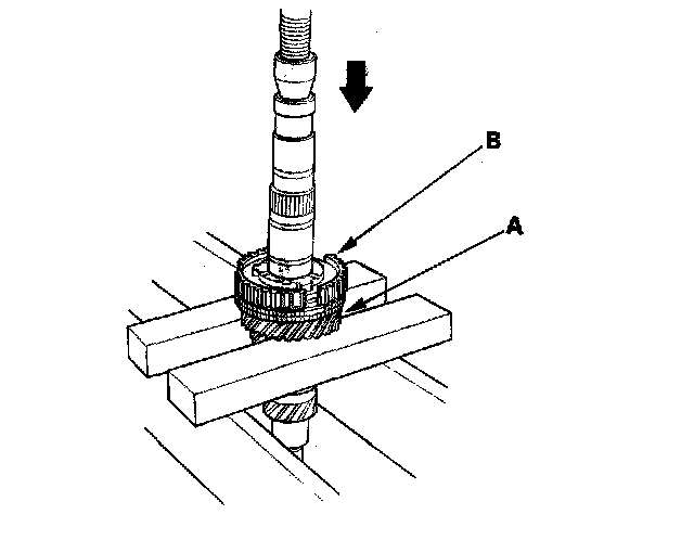 2. Support 5th gear (A) on steel blocks, and press the mainshaft out of the 5th synchro hub (5-speed model) or 5th/6th synchro hub (6-speed model) (B). Use of a jaw-type puller can damage the gear teeth.