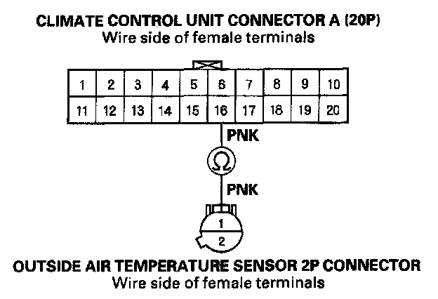 7. Check for continuity between the No. 16 terminal of climate control unit connector A (20P) and the No. 1 terminal of the outside air temperature sensor 2P connector.
