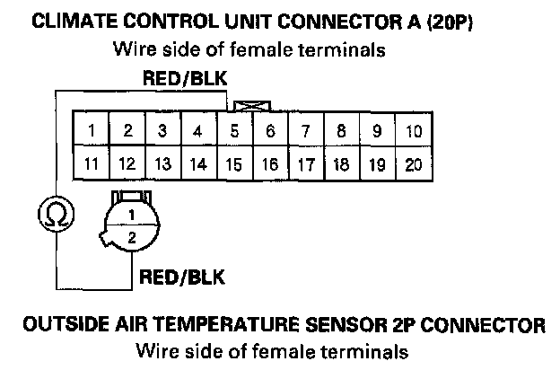 8. Check for continuity between the No. 5 terminal of climate control unit connector A (20P) and the No. 2 terminal of the outside air temperature sensor 2P connector.