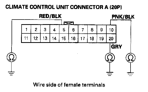 8. Check for continuity between body ground and climate control unit connector A (20P) terminals No. 5, 10 and 20 individually, and between body ground and climate control unit connector B (16P) terminals No. 3 and 4 individually.