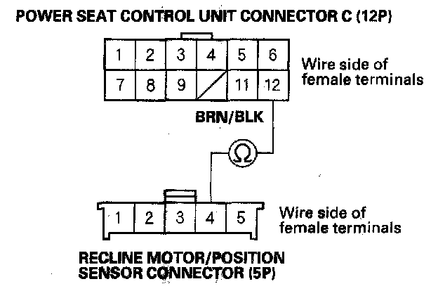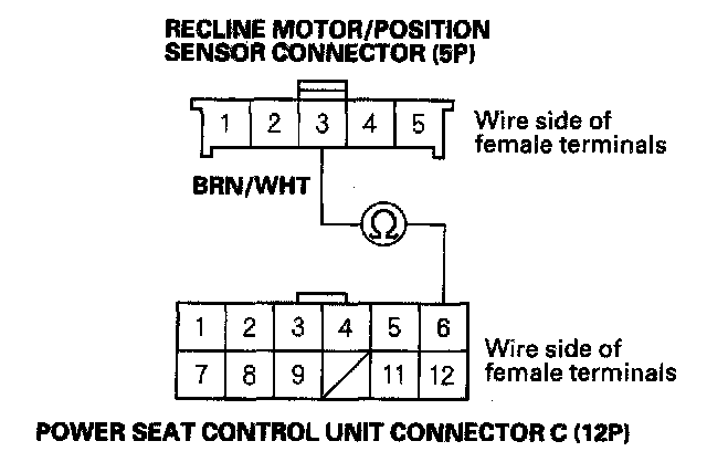 8. Check for continuity between the recline motor/position sensor connector (5P) No. 5 terminal and power seat control unit connector C (12P) No. 5 terminal.