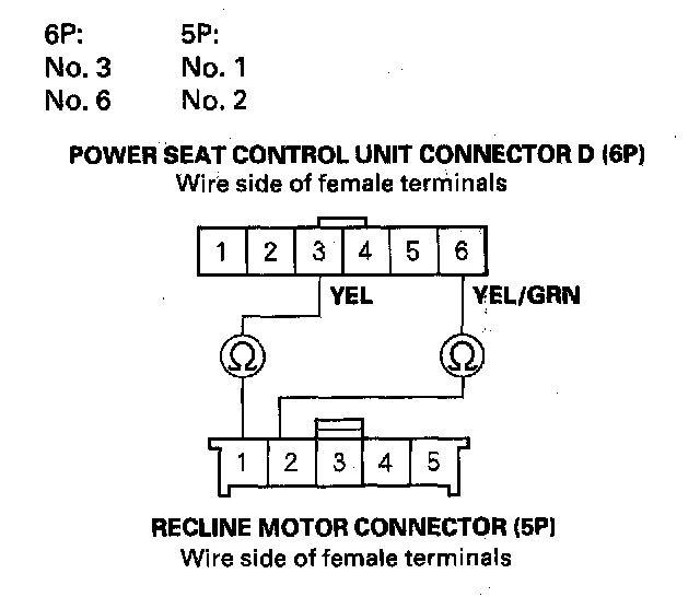 22. Check for continuity between the following terminals of the power seat control unit connector D (6P) and the recline motor connector (5P).
