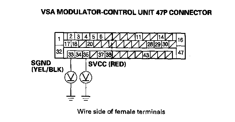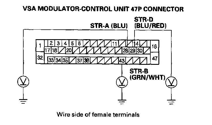 10. Measure the voltage between body ground and the VSA modulator-control unit 47P connector terminal No. 28, No. 29, and No. 43 individually.