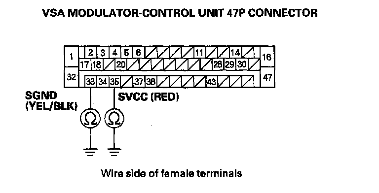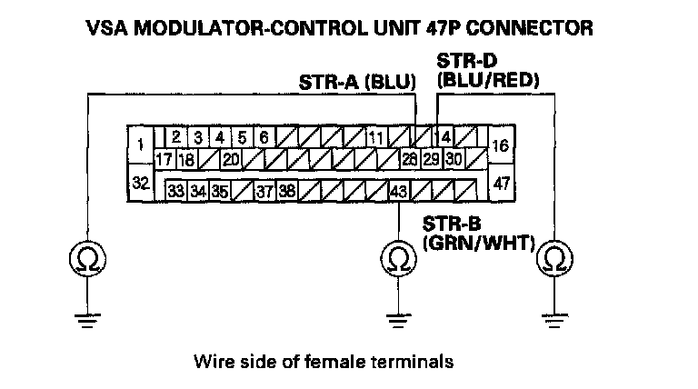 13. Check for continuity between body ground and the VSA modulator-control unit 47P connector terminal No. 28, No. 29, and No. 43 individually.