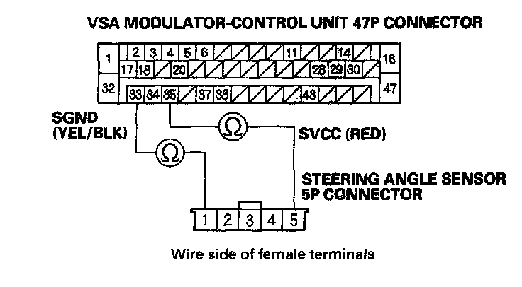 14. Check for continuity between the VSA modulator-control unit 47P connector terminal No. 33, No. 35 and steering angle sensor 5P connector terminal No. 1, No. 5 respectively.