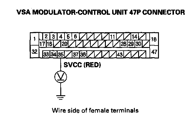 7. Measure the voltage between the VSA modulator-control unit 47P connector terminal No. 35 and body ground.
