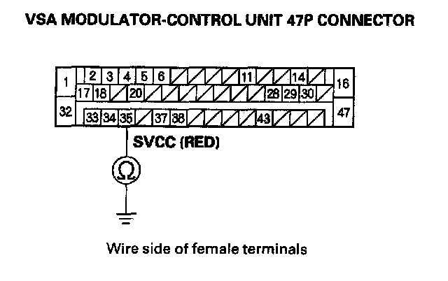 9. Check for continuity between the VSA modulator-control unit 47P connector terminal No. 35 and body ground.
