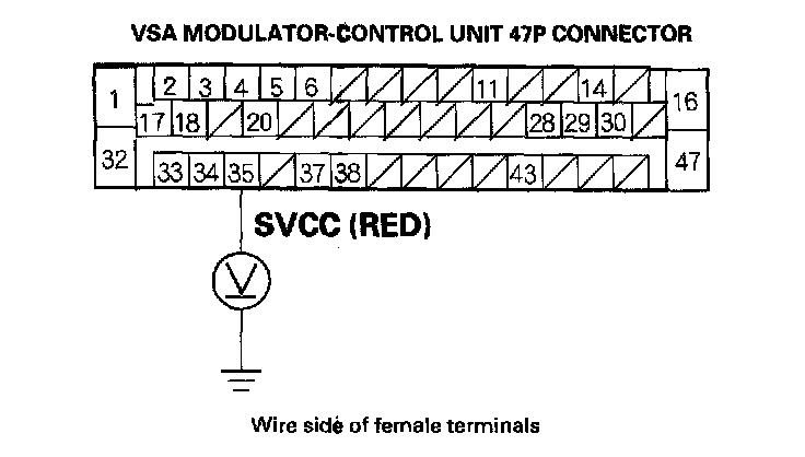 8. Measure the voltage between the VSA modulator-control unit 47P connector terminal No. 35 and body ground.