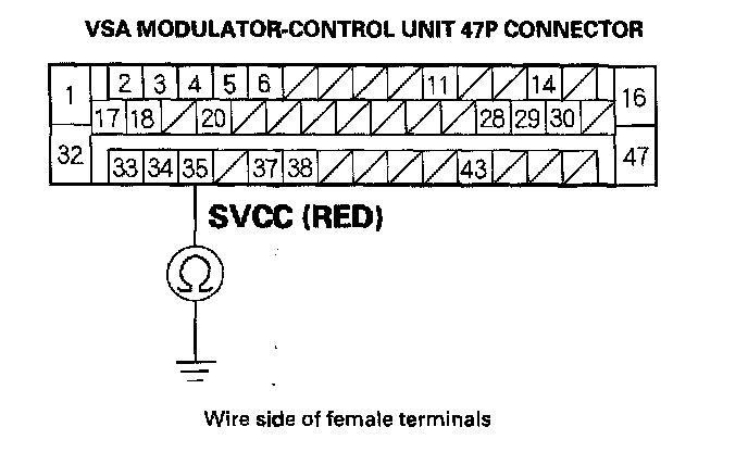 9. Check for continuity between the VSA modulator-control unit 47P connector terminal No. 35 and body ground.