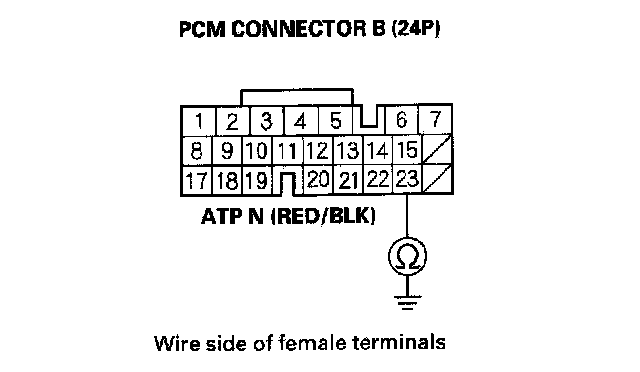 22. Check for continuity between PCM connector terminal B23 and body ground.