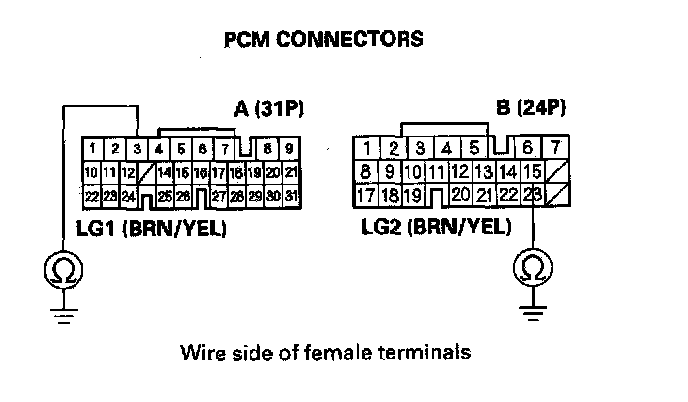 9. Check for continuity between PCM connector terminals A3 and body ground, and between B15 and body ground.