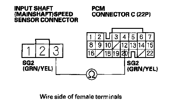 17. Check for continuity between input shaft (mainshaft) speed sensor connector terminal No. 3 and PCM connector terminal C12.