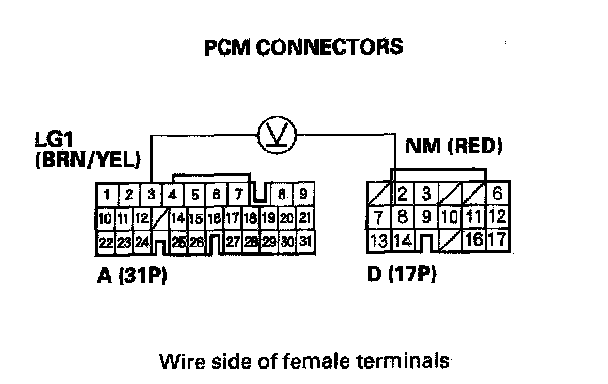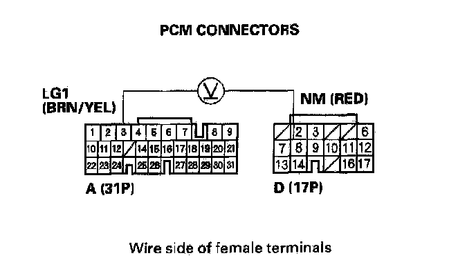 24. With the engine idling, measure the voltage between PCM connector terminals D8 and A3.
