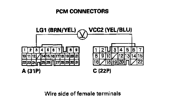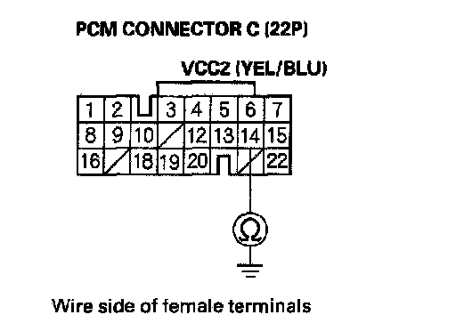 NO - Check for loose or poor connections at PCM connector terminal C14. If the connection is OK, update the PCM if it does not have the latest software, or substitute a known-good PCM, then recheck. If the symptom/indication goes away with a known-good PCM, replace the original PCM.