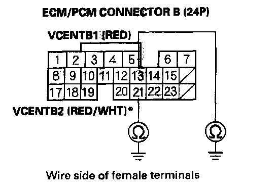 10. Check for continuity between ECM/PCM connector terminal B13 (B21)* and body ground.