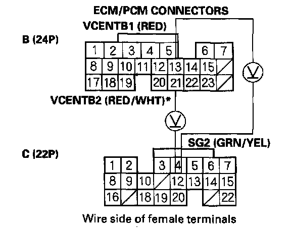 13. Measure voltage between ECM/PCM connector terminals B13 (B21)* and C12.