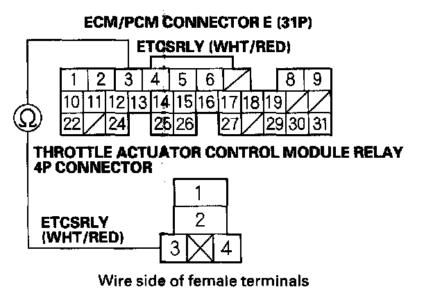 30. Check for continuity between ECM/PCM connector terminal E3 and throttle actuator control module relay 4P connector terminal No.3.