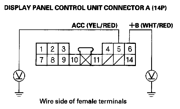 NO - If the +B wire does not have voltage, repair the open in the wire between the under-dash fuse/relay box and the display panel control unit. If the ACC wire does not have voltage, repair the open in the wire between the under-dash fuse/relay box and the display panel control unit.