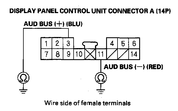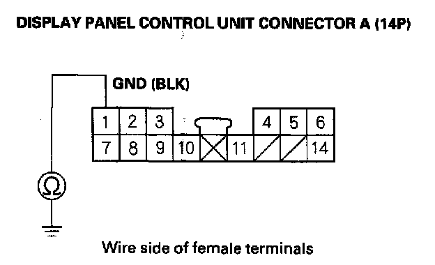 9. Check for continuity between display panel control unit connector A (14P) terminal No. 1 and body ground.