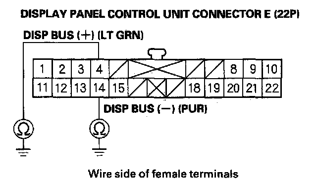 11. Check for continuity between body ground and display panel control unit connector E (22P) terminal No. 4 and No. 14 individually.