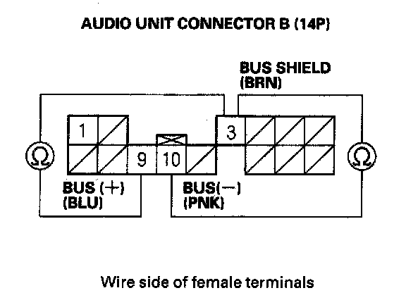 13. Check for continuity between audio unit connector B (14P) terminal No. 3 and terminals No. 9 and No. 10 individually.