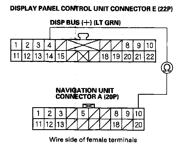 15. Check for continuity between display panel control unit connector E (22P) terminal No. 4 and navigation unit connector A (20P) terminal No. 10.