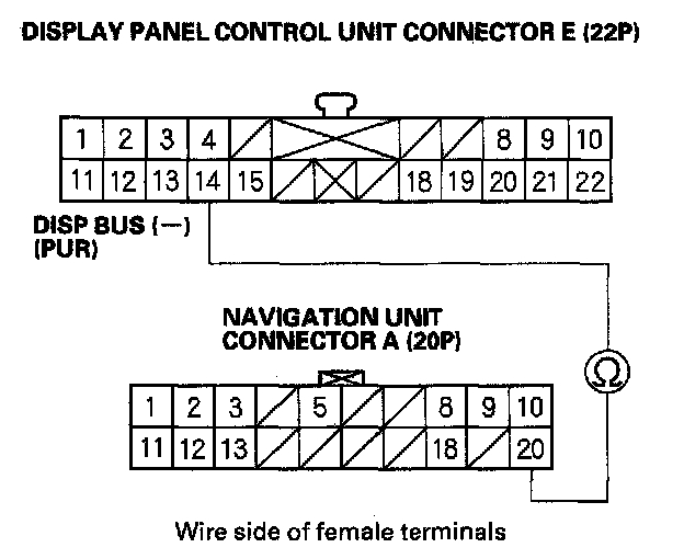 16. Check for continuity between display panel control unit connector E (22P) terminal No. 14 and navigation unit connector A (20P) terminal No. 20.