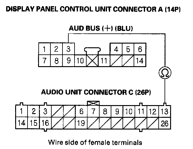 17. Check for continuity between display panel control unit connector A (14P) terminal No. 3 and audio unit connector C (26P) terminal No. 13.
