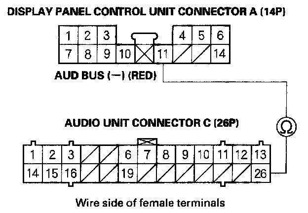 18. Check for continuity between display panel control unit connector A (14P) terminal No. 11 and audio unit connector C (26P) terminal No. 26.