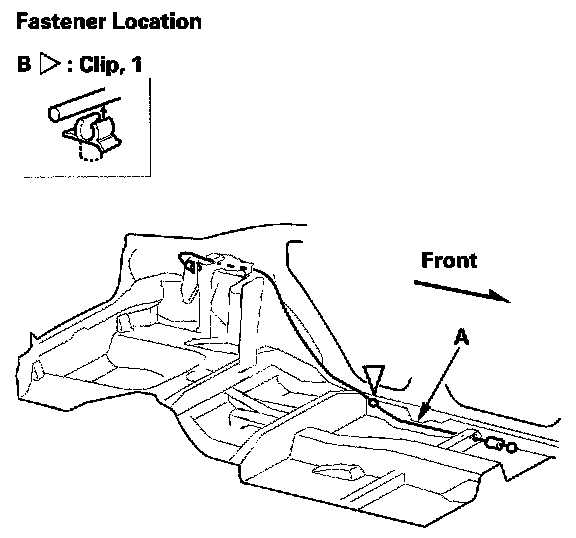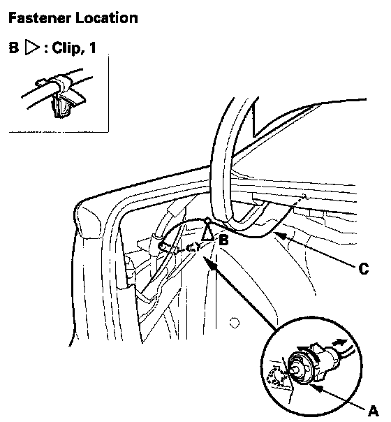 3. Release the fuel fill door opener cable (A) from the clip (B).