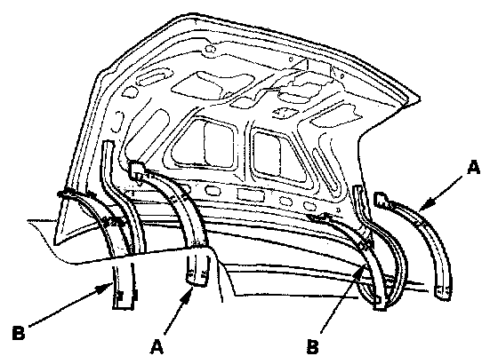 3. Remove the trunk hinge upper trim (A) and trunk hinge lower trim (B), if necessary.