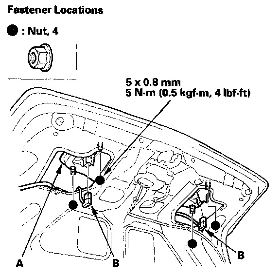 2. From inside the trunk lid, remove the nuts securing the rear license trim (A), disconnect the back-up light connectors (B).