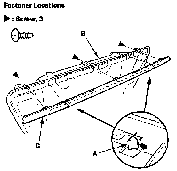 4. If necessary, remove the screws and hooks (A) from the rear license trim (B), then remove the rear license trim molding (C).