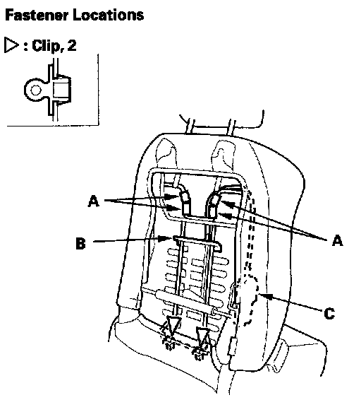 4. Remove the metal clamps (A) and detach the clips, then remove the lumbar support (B) and motor (C) as an assembly.