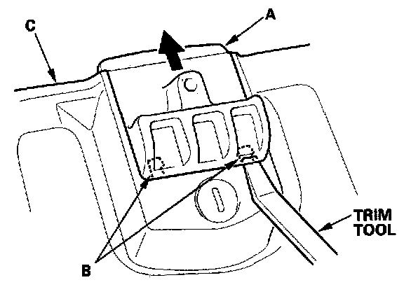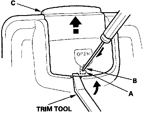 3. While pressing the hook, pry the trunk-side handle (C) up with a trim tool.