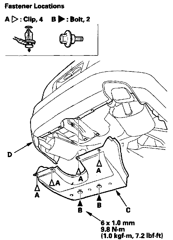 Rear Under Cover Replacement1. Remove the clips (A) and bolts (B), then remove the rear under cover (C). Take care not to scratch the rear bumper (D).