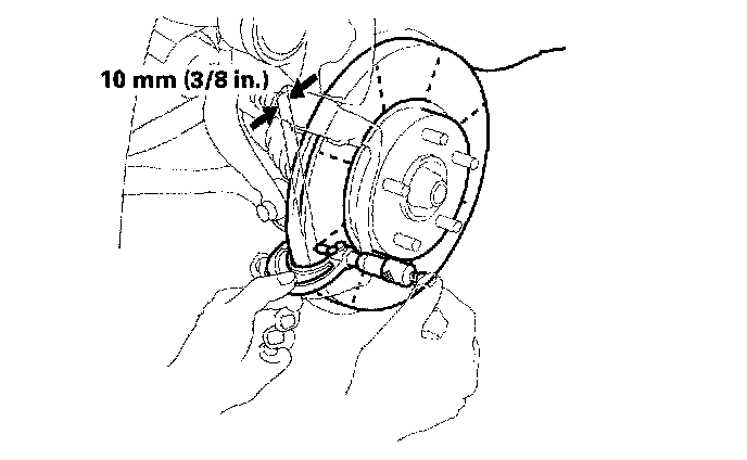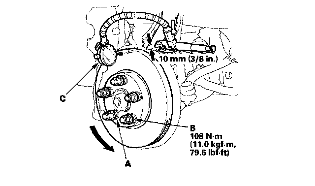 6. Set up the dial gauge (C) against the brake disc as shown, and measure the runout at 10 mm (3/8 inch) from the outer edge of the brake disc.