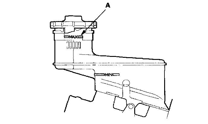 1. Make sure the brake fluid level in the reservoir is at the MAX (upper) level line (A).