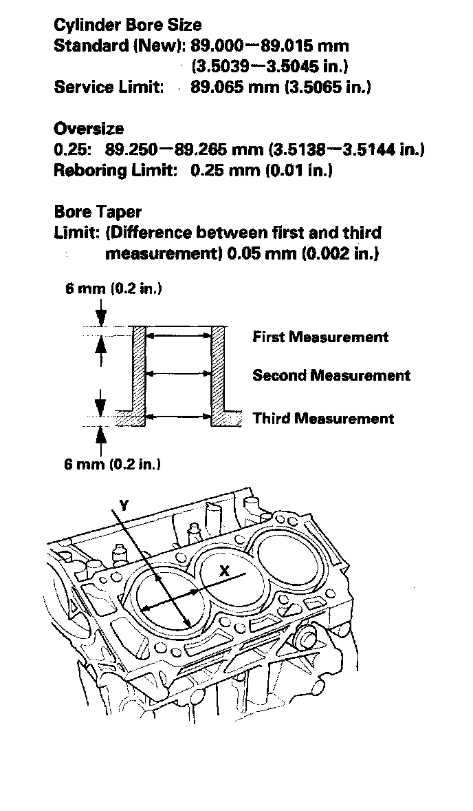 4. Measure wear and taper in direction X and Y at three levels in each cylinder as shown. If measurements in any cylinder are beyond the oversize bore service limit, replace the engine block. If the engine block has to be rebored, refer to step 7 after reboring.