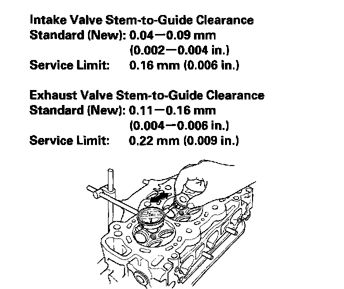 3. Subtract the valve stem O.D. (measured with a micrometer) from the valve guide I.D. (measured with an inside micrometer or ball gauge). Take the measurements in three places along the valve stem and three places inside the valve guide. The difference between the largest guide measurement and the smallest stem measurement should not exceed the service limit.