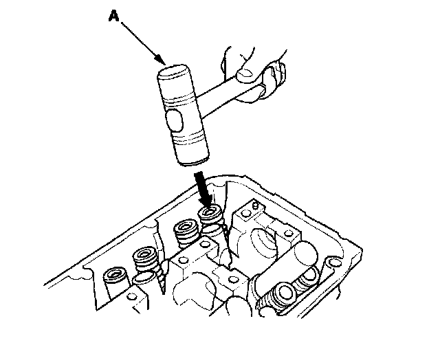 8. Lightly tap the end of each valve stem two or three times with a plastic mallet (A) to ensure proper seating of the valve and valve cotters. Tap the valve stem only along its axis so you do not bond the stem.