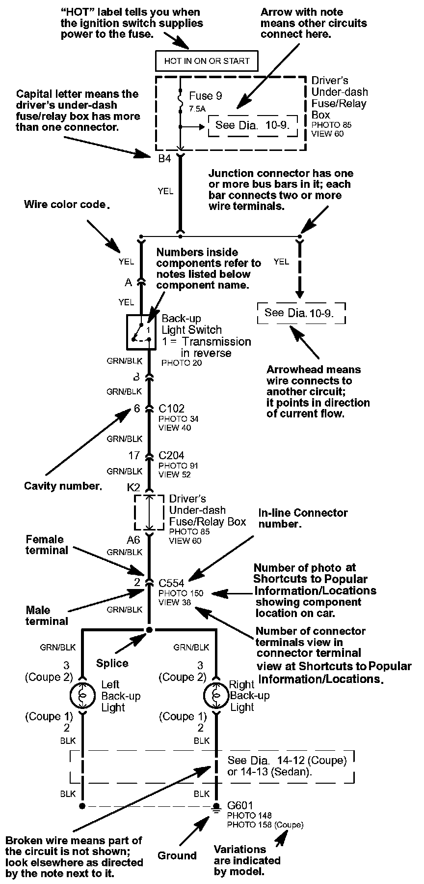 Below most connector numbers and component names are PHOTO and VIEW numbers. The PHOTO number refers to a photo at shortcuts to Popular Information/Locations that shows the connector's location on the car. The VIEW number refers to an connector view at shortcuts to Popular Information/Locations that shows the connector terminals, wire colors, connector cavity numbers, and other details.