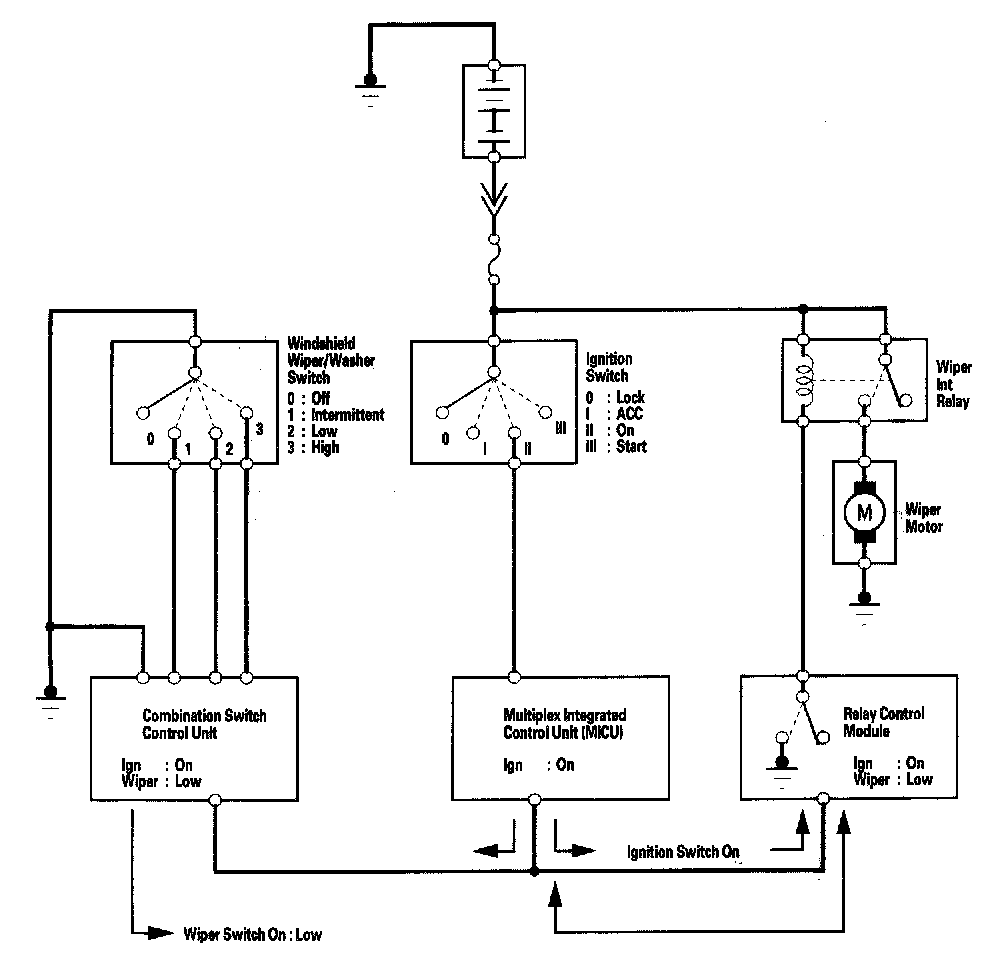 Messages are transmitted by an ECU (that monitors an input) over the communication circuit. ECUs that use the message (information related to that input) are the receivers. For example, the combination switch control unit monitors the wiper switch. When the wiper switch is placed in the low speed position, the combination switch control unit transmits that message on the communication circuit. The relay control module receives the message and turns on the wipers by providing a ground for the relay.