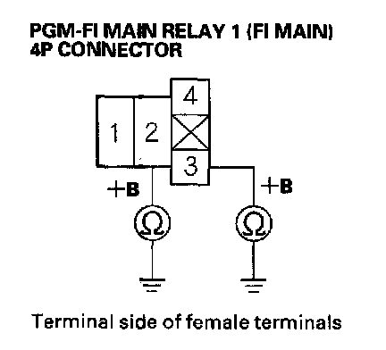 27. Check for continuity between body ground and PGM-FI main relay 1 (FI MAIN) 4P connector terminals No.2 and No.3 individually.
