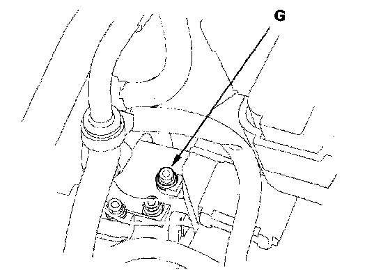 25. Start the engine, and let it warm up until the radiator fan comes on. Then shift to the L position, release the brake pedal, and measure the 1st clutch pressure at the 1st clutch pressure inspection port (G) while holding engine speed at 2,000 rpm.