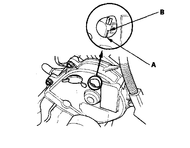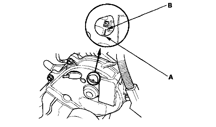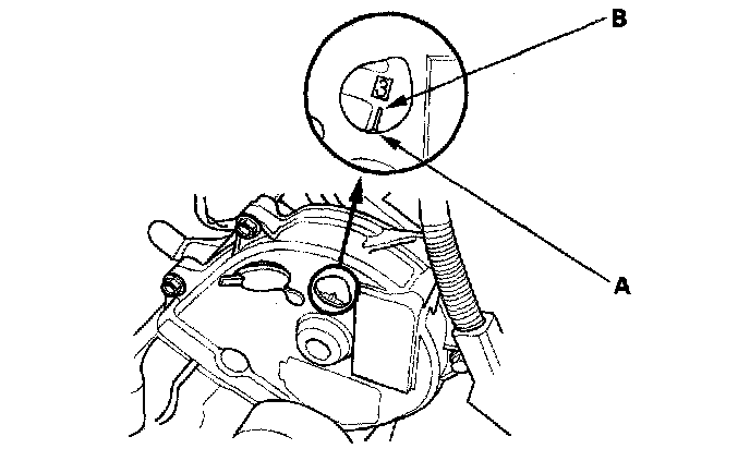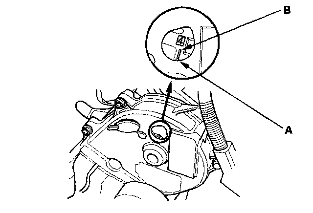 3. Set the No. 1 piston at top-dead center (TDC). Align the pointer (A) on the front upper cover with the No. 1 piston TDC mark (B) on the front camshaft pulley.