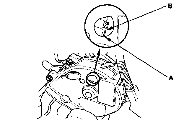 8. Rotate the crankshaft clockwise. Align the pointer (A) on the front upper cover with the No. 4 piston TDC mark (B) on the front camshaft pulley.