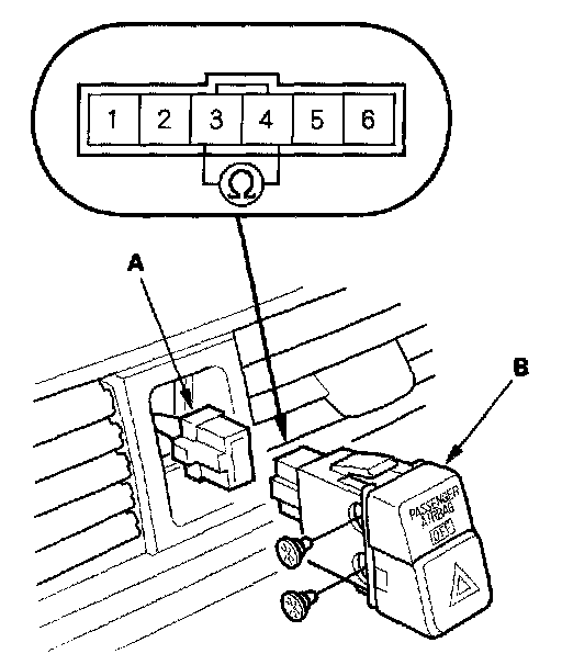 3. Disconnect the 6P connector (A) from the passenger's airbag cutoff indicator (B).