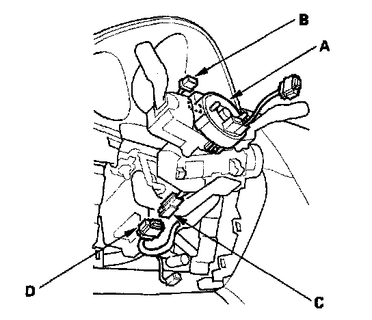 9. Disconnect the dashboard wire harness 4p connector (A) from the cable reel 4P connector (B), then disconnect the dashboard wire harness 13P connector (C) from the cable reel (D).